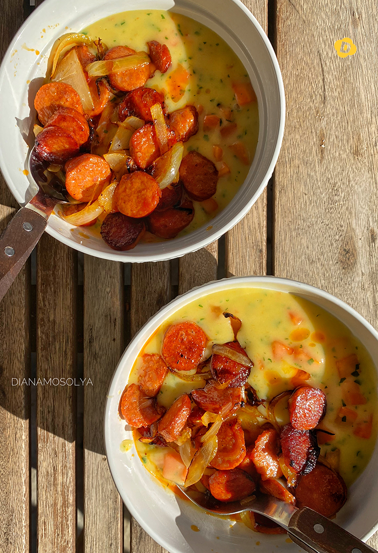 HOZZÁ: 4-5 szép, nagy, egészséges répa hámozva és apróra vágva, 1 ek olaj, 1-2 ek nádcukor, 2-3 csipet só, annyi víz, amennyi ellepi, 1 kis csokor petrezselyem apróra vágva, 2 ek liszt, 2,5 dl tej, 1 tk vaj és pár debreceni kolbász karikázva és hagymával kevés olajon, serpenyőben átsütve